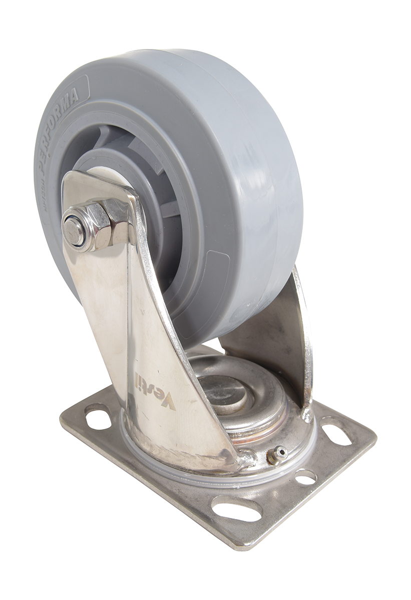 Stainless steel casters are excellent for corrosion resistance. They are ideal for applications where frequent wash downs are a necessity or have exposure to cleaning agents, steam, or other corrosive agents which could rust or corrode. Thermoplastic rubber (TPR) provides a smooth quiet ride with a non-marking tread. It offers great floor preservation and is resistant to most chemicals.