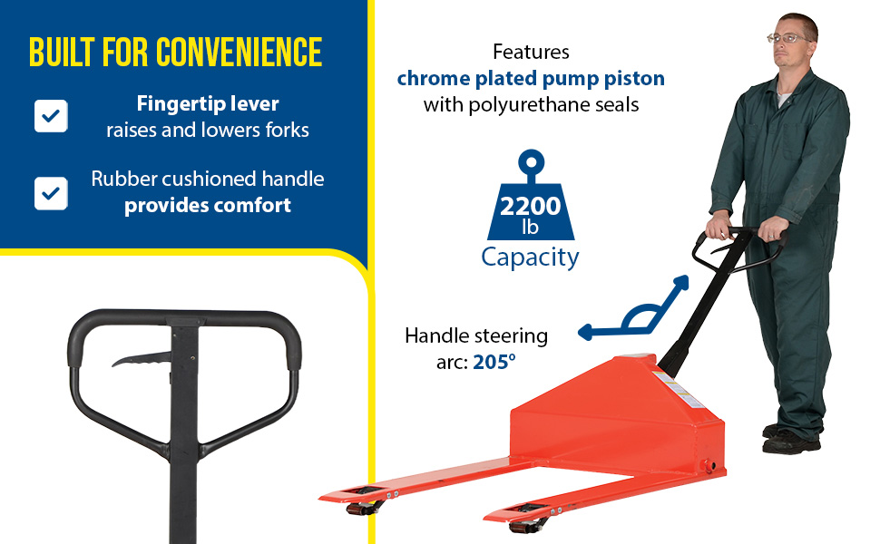 These pallet trucks are ideal for skids and low profile pallets. Features 1-1/2" lowered fork height for extra low profile skids, pallets or machinery. Fingertip lever switch for raise, lower and neutral operation. Rubber cushioned handle grip. Baked-in powder coat finish for added toughness. Individual fork width is 6-1/2".