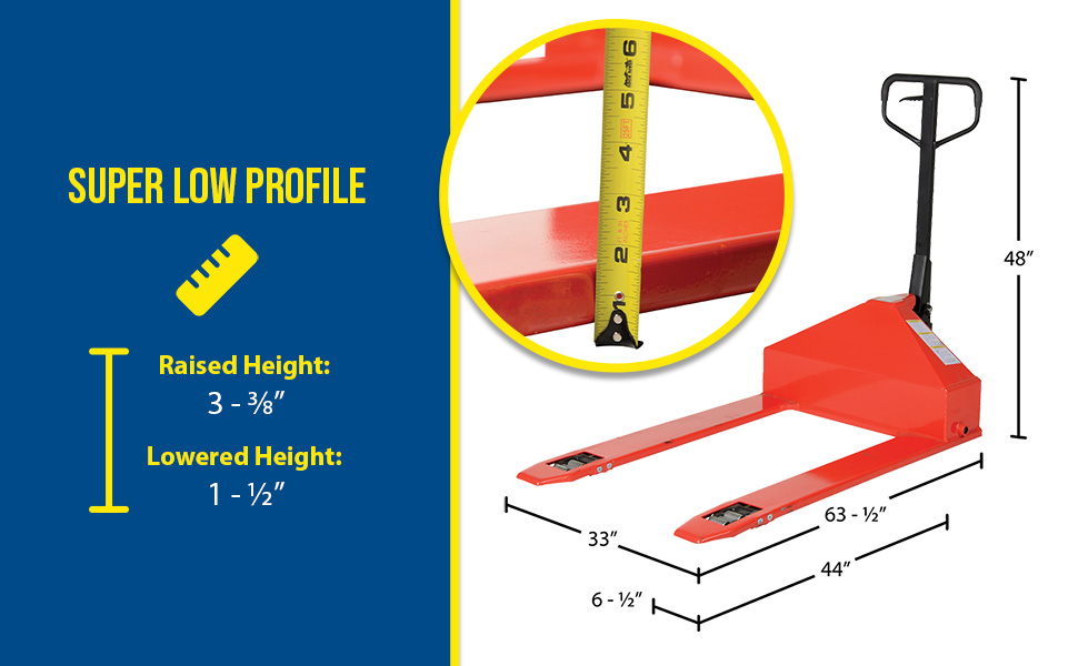 PM2-3344-SLP PM2-3344-SLPSteel Super Low Pallet Truck 63-1/2 In. x 33 In. x 44 In. 2200 Lb. Capacity RedUniform Capacity (lb.): 2200