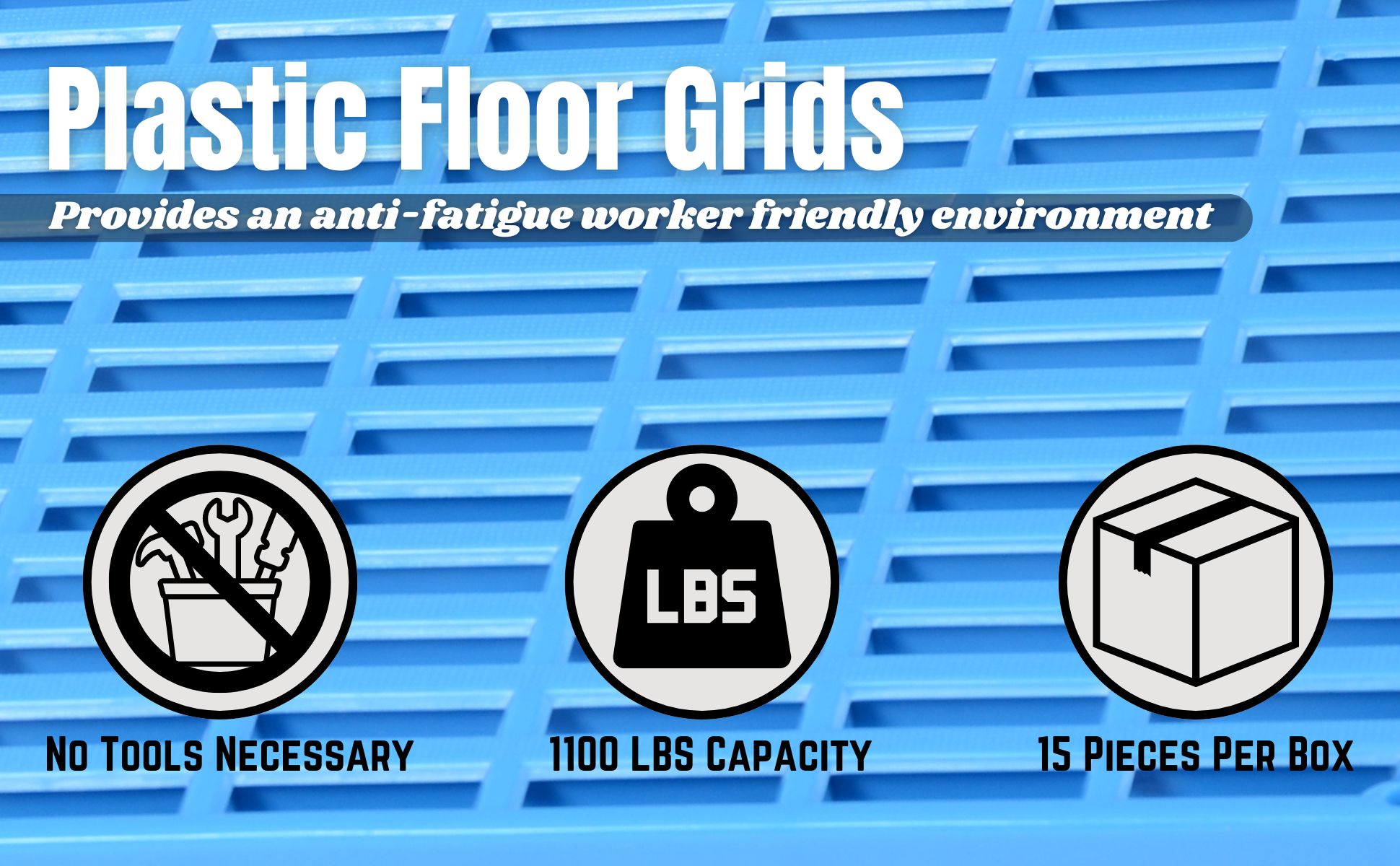 Ideal for storing product at an elevated height above cold and damp floors. Alternatively used as an ergonomic work surface to provide an anti-fatigue worker friendly environment. Snap together, abrasion resistant "GRID" sections are ideal for wet floors such as paint booths, car washes, or general work areas. Lightweight units are only 2 lbs. per section. Easy to attach, no hardware necessary. Sold 15 per box.