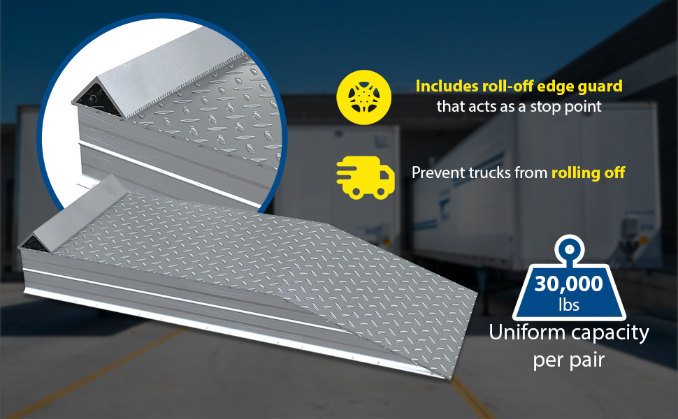 ATWR-ROG-18-6-60 ATWR-ROG-18-6-60Aluminum Tread Plate Wheel Riser with Roll Off Guard 60 In. x 18 In. x 8-1/16 In. 30000 Lb. Capacity SilverUniform Capacity (lbs.): 30,000