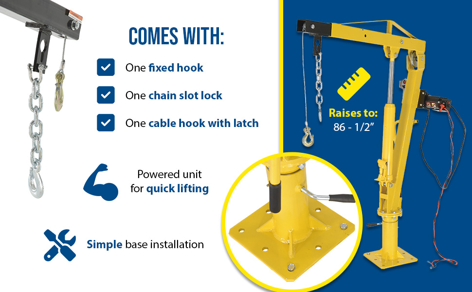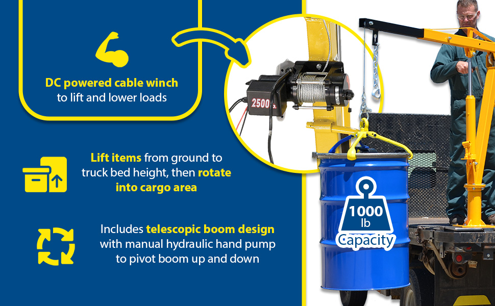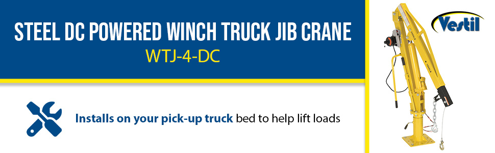 WTJ-2%20B.jpgInstalled in your pick-up truck bed, this winch operated jib crane will help lift loads. Lift items from ground to truck bed height, then rotate into cargo area. Includes telescopic boom design with manual hydraulic hand pump to pivot boom up and down. Cable usable length for all models is 24', except WTJ-2 (9' model WTJ-2). Unit comes with one fixed hook, one chain slot lock, and one cable hook with latch. The crane swivels on a 360 degree base. Safety yellow, galvanized or stainless steel finish available. Manual cable winch and 12V DC power cable winch styles available.