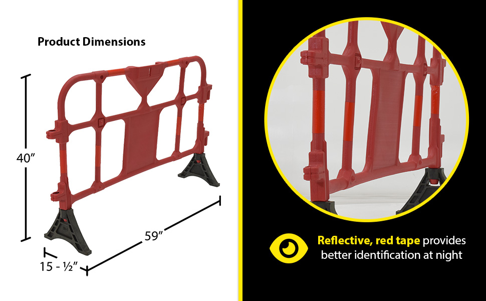 Plastic Interlocking Barriers will not rust and will retain attractive appearance. Reflective red tape provides better identification at night. Barrier ends include connectors for interlocking multiple units. Base feet are 15-1/2"L x 3"W. The non-removable feet come pre-filled with sand for weight ballast. Feet can be rotated 90 degrees to allow for barriers to be stacked. Manufactured from HDPE material and includes UV stabilizer for longer life. Ships and stores assembled.