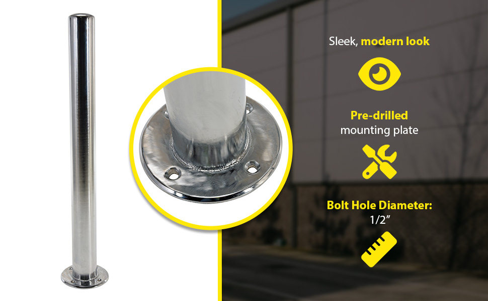 Improve the image of your facility while protecting people and equipment with this heavy-duty Chrome Bollard. Unit is made of steel and finished with an attractive bright chrome plating for a clean fresh look. Mounting hole diameter. is 1/2" x 4 holes Mounting plate outer diameter is 8" Mounting plate thickness is 3/8". Recommended for indoor use.