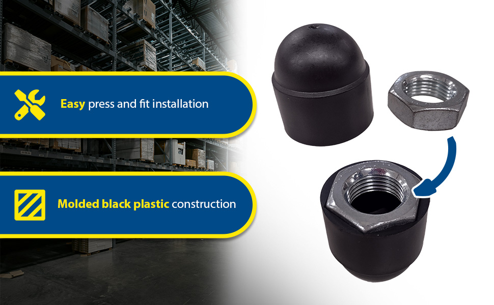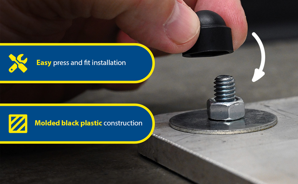 Bolt Covers are designed to finish and protect bolt heads. They have an easy press fit installation over the existing nut. Molded black plastic construction. Plastic Hardware Caps snap over the top of anchor bolts and washers to protect from weathering.