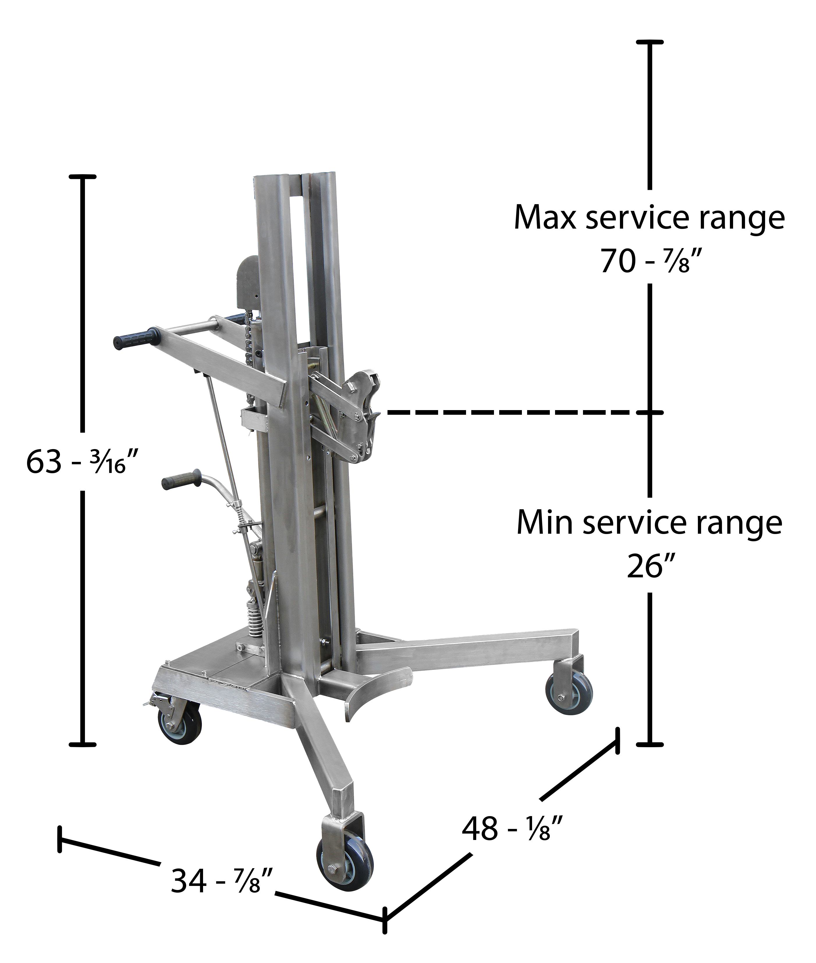 DRUM-LT-SS DRUM-LT-SSStainless Steel Drum Lifter/Transporter 35 In. x 48 In. x 63 In. 800 Lb. Capacity SilverUniform Capacity (lb.): 800