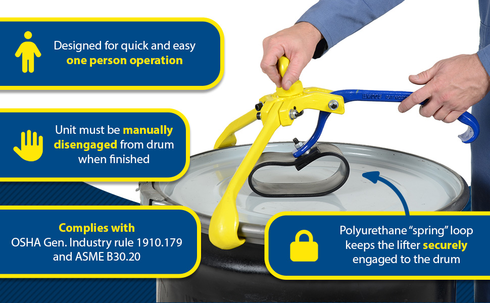 Designed exclusively for lifting closed and open-head 55 gallon steel drums with a secured lid installed. Not for use on open-head drums without a lid. This product works on select 55 gallon plastic and fiber drums with a top lip strong enough to hold the weight of the drum. Designed for quick and easy one person operation, with drum in a vertical position. The narrow profile design is great for picking up drums packed close together. The three-arm ductile-iron design offers maximum strength and simplicity allowing the centering of the drum under the lifter. The polyurethane "spring" loop keeps the lifter securely engaged to the drum, which is especially beneficial when using the lifter in a rough environment including swinging, bouncing, and incidental collisions. Unit must be manually disengaged from the drum when finished with use.
