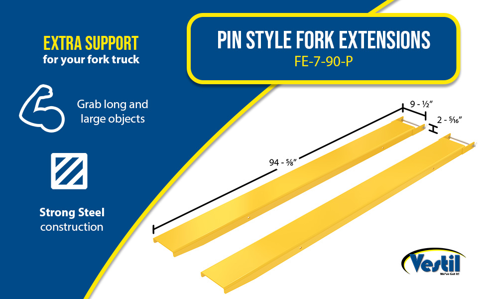 FE-5-90-P FE-5-90-PSteel Pin Style Fork Extensions 5 In. x 90 In. 4,000 Lb. Capacity YellowUniform Capacity Per Pair (lb.): 4,000