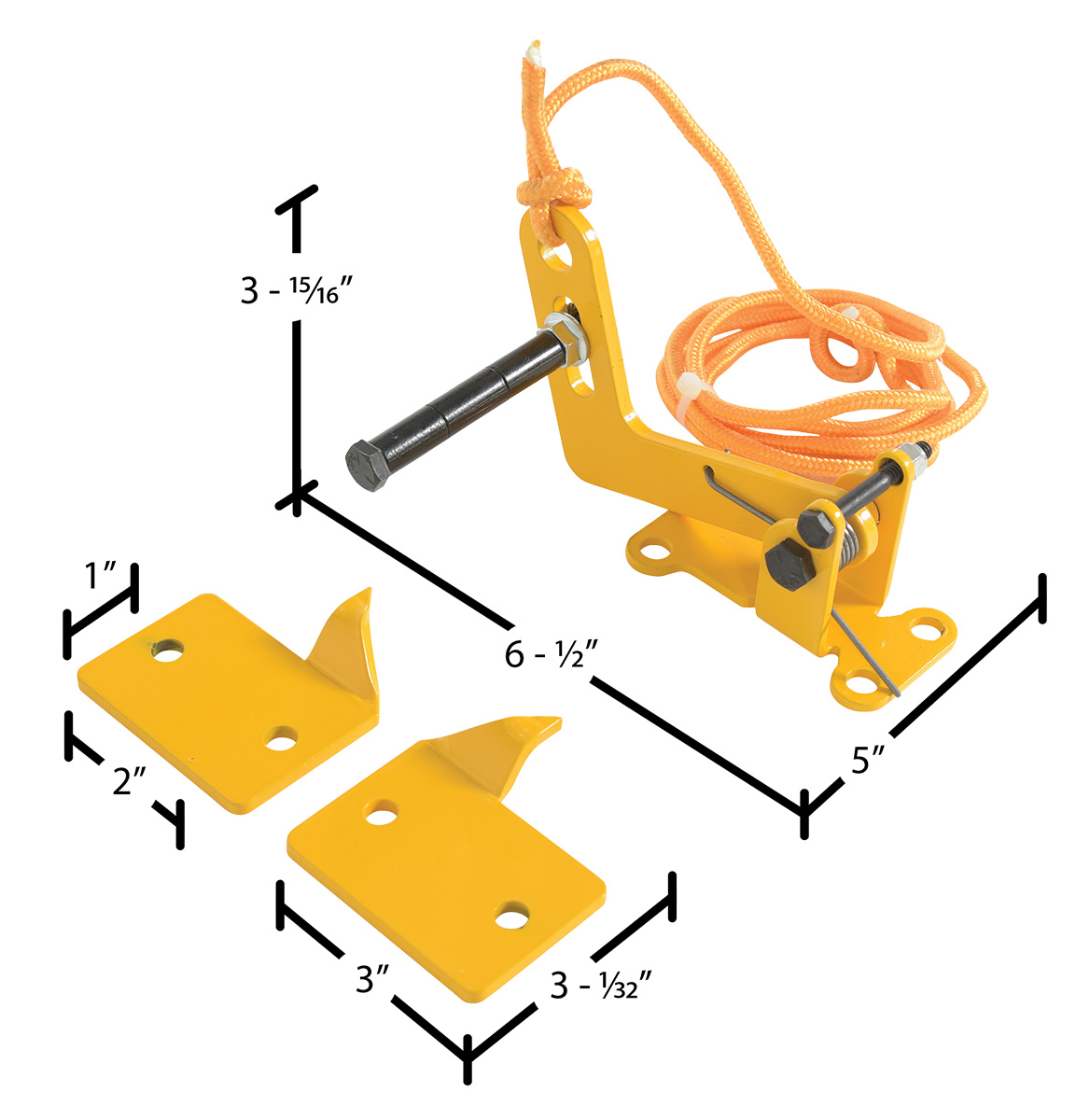 Unique product will allow overhead doors to be locked in virtually any up position. Automatically locks doors in full up position or in the closed position. Prevents the overhead door from unexpectedly "slamming down". Protects personnel, product, and equipment. Spring loaded locking latch is released by pulling rope (included). Simply bolts to any overhead door (installation hardware is not included). Includes two reversible "locking plates" that may be mounted anywhere along door track. Steel construction with yellow painted finish.