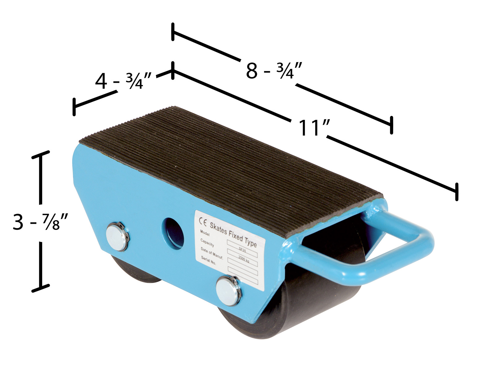 This machinery skate is designed to move heavy equipment and machinery. Nylon wheels are strong and will not mark floors. The top of each skate includes a rubber surface for extra grip. Steel construction with handle to carry and position. On this fixed skate dolly size is nonadjustable and wheels are rigid. Designed primarily for moving in straight lines.