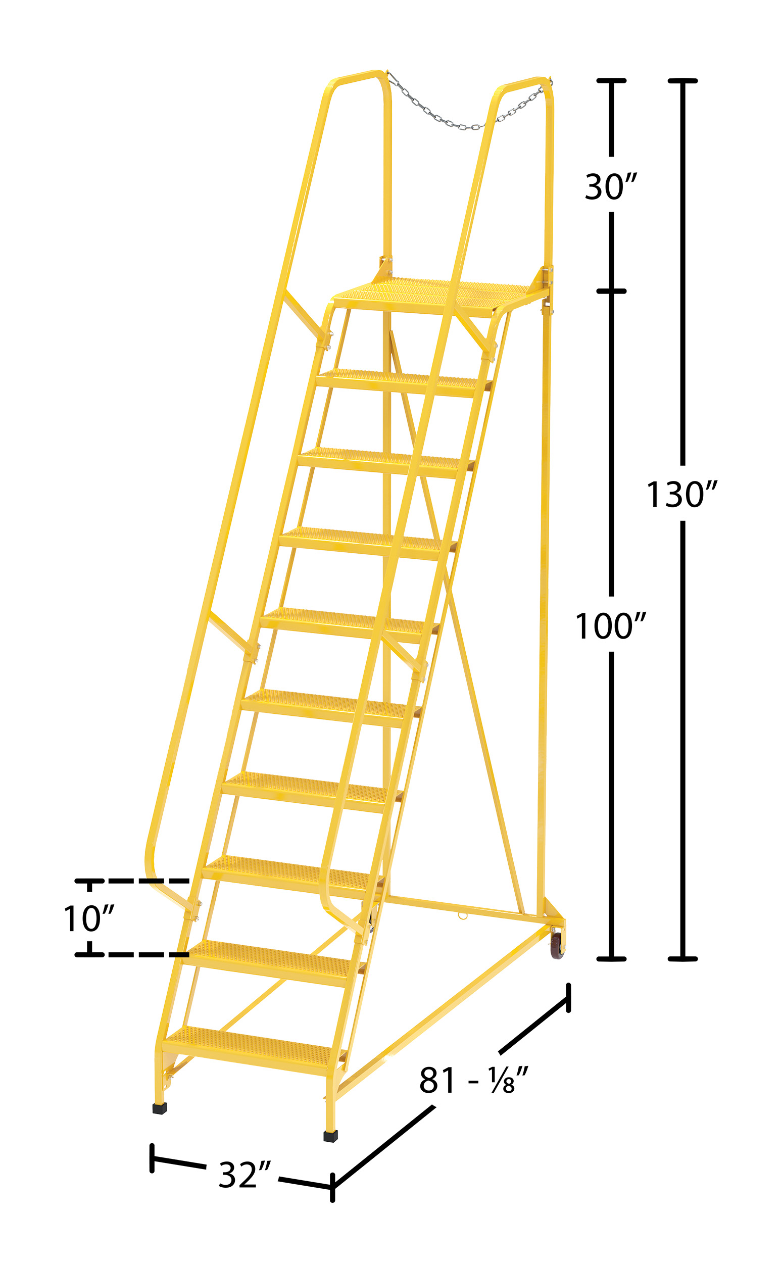 Top Step Height (in.): 100 Hand Rail Height (in.): 30 Top Platform Length (in.): 21